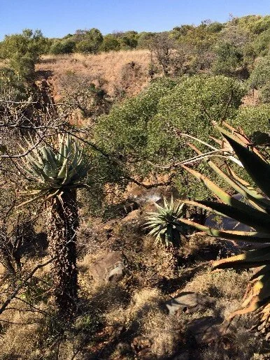 Enormous aloes and other wild vegetation across the gorge from the lodge at Iwamanzi. From this vantage point, we enjoyed watching the wildlife pass by on the hillside.