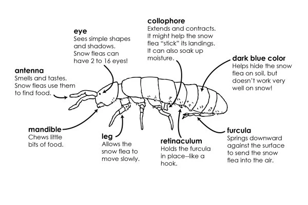 I know what snow fleas are, or so I thought. But, what are springtails? I’d never heard of this term, so did some research. Springtails are essentially the "un-invited roommates" of the bug world. They are so weird that scientists actually kicked them out of the official insect club because their mouthparts are tucked inside their heads (like a built-in retainer) instead of sticking out like a normal bug’s. These tiny, wingless arthropods are famous for their ability to use their tail parts to “spring” up to 100 times their body length!